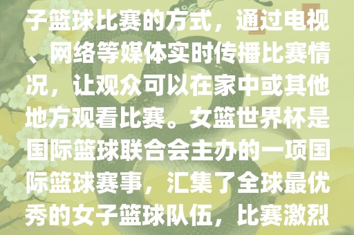 直播女篮世界杯是一种观看女子篮球比赛的方式,通过电视、网络等媒体实时传播比赛情况,让观众可以在家中或其他地方观看比赛。女篮世界杯是国际篮球联合会主办的一项国际篮球赛事,汇集了全球最优秀的女子篮球队伍,比赛激烈、精彩纷呈。