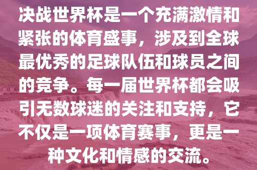 决战世界杯是一个充满激情和紧张的体育盛事,涉及到全球最优秀的足球队伍和球员之间的竞争。每一届世界杯都会吸引无数球迷的关注和支持,它不仅是一项体育赛事,更是一种文化和情感的交流。