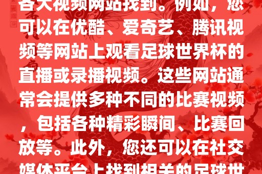 可以在各大视频网站观看足球世界杯的直播或录播视频,如优酷、爱奇艺、腾讯视频等。这些网站提供多种比赛视频,包括精彩瞬间和比赛回放等。社交媒体平台上也有相关视频分享。摘要字数控制在100-200字左右。