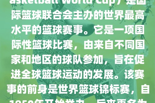 国际篮联篮球世界杯(FIBA Basketball World Cup)是国际篮球联合会主办的世界最高水平的篮球赛事。它是一项国际性篮球比赛,由来自不同国家和地区的球队参加,旨在促进全球篮球运动的发展。该赛事的前身是世界篮球锦标赛,自1950年开始举办,后来更名为篮球世界杯。