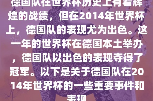 德国队在世界杯历史上有着辉煌的战绩,但在2014年世界杯上,德国队的表现尤为出色。这一年的世界杯在德国本土举办,德国队以出色的表现夺得了冠军。以下是关于德国队在2014年世界杯的一些重要事件和表现