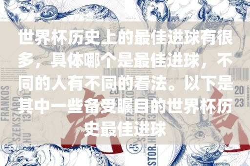 关于世界杯历史最佳进球,众说纷纭。以下是备受瞩目的几个进球简介:,,在世界杯的历史长河中,众多精彩进球留下了难以磨灭的印象。每个球迷心中都有自己心目中的最佳进球,而一些标志性进球如阿根廷球星迭戈·马拉多纳的“世纪进球”、英格兰球员加里·莱因克尔的远距离射门等,都成为了世界杯历史上的经典瞬间。这些进球以其独特的方式和震撼力,被永远铭记在足球史册中。