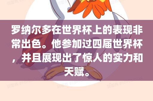 在2002年韩日世界杯上,罗纳尔多的表现尤为出色,他帮助巴西队获得了冠军,并获得了多项个人荣誉,包括最佳球员和最佳射手等,他在比赛中的表现令人惊叹,展现出了他的速度、技术和射门能力等方面的天赋。