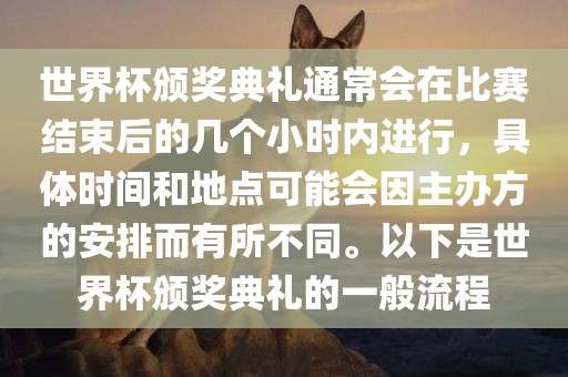 世界杯颁奖典礼通常会在比赛结束后的几个小时内进行,具体时间和地点可能会因主办方的安排而有所不同。以下是世界杯颁奖典礼的一般流程
