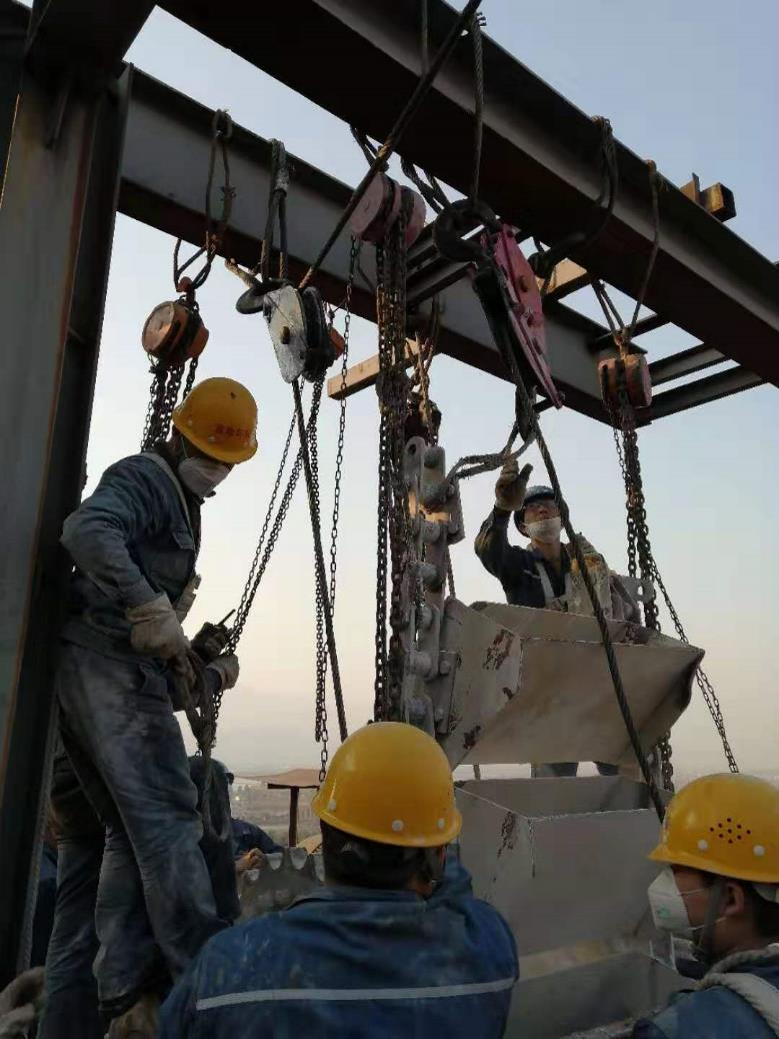 剛完成A2斗提鏈條的大修,A4鏈條又出現新問(wèn)題。19日凌晨04:10A4斗提鏈條突然斷裂,檢修班長(cháng)王成東立刻帶領(lǐng)人員到現場(chǎng)處理設備故障,經(jīng)現場(chǎng)檢查發(fā)現50米高的斗提鏈條全部掉到斗提箱體的中部,需要將兩側斗提鏈條吊至50高的頭輪上,再進(jìn)行對接。如果采用兩臺250噸的吊車(chē),將花費至少3萬(wàn)元的費用,通過(guò)大家的討論,最終采用兩臺10噸卷?yè)P機加45噸的手拉葫蘆吊裝斗提鏈條,成功的將斗提鏈條吊至50米高的頭輪上。