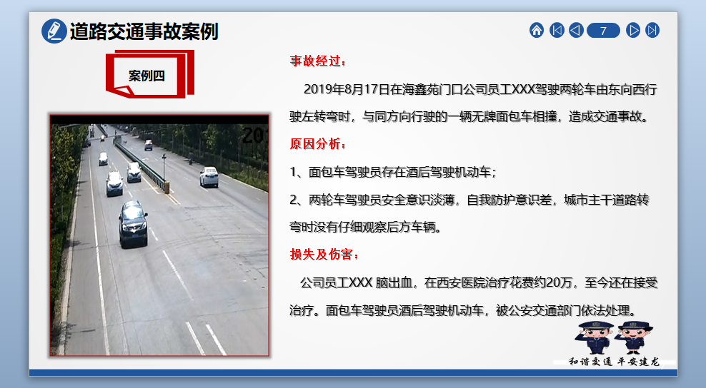 培訓分為兩部分,交通安全培訓和消防培訓。交通安全培訓從道路交通事故案例、事故的原因及影響、交通安全現狀、如何預防交通事故、管理規定及要求五方面進(jìn)行;消防培訓從消防安全知識、消防裝備介紹及使用、監督檢查的典型問(wèn)題、消防安全四個(gè)能力建設、消防安全管理辦法(摘要)和警示案例七方面進(jìn)行,培訓完組織員工進(jìn)行消防、道路安全考試,保證培訓質(zhì)量。