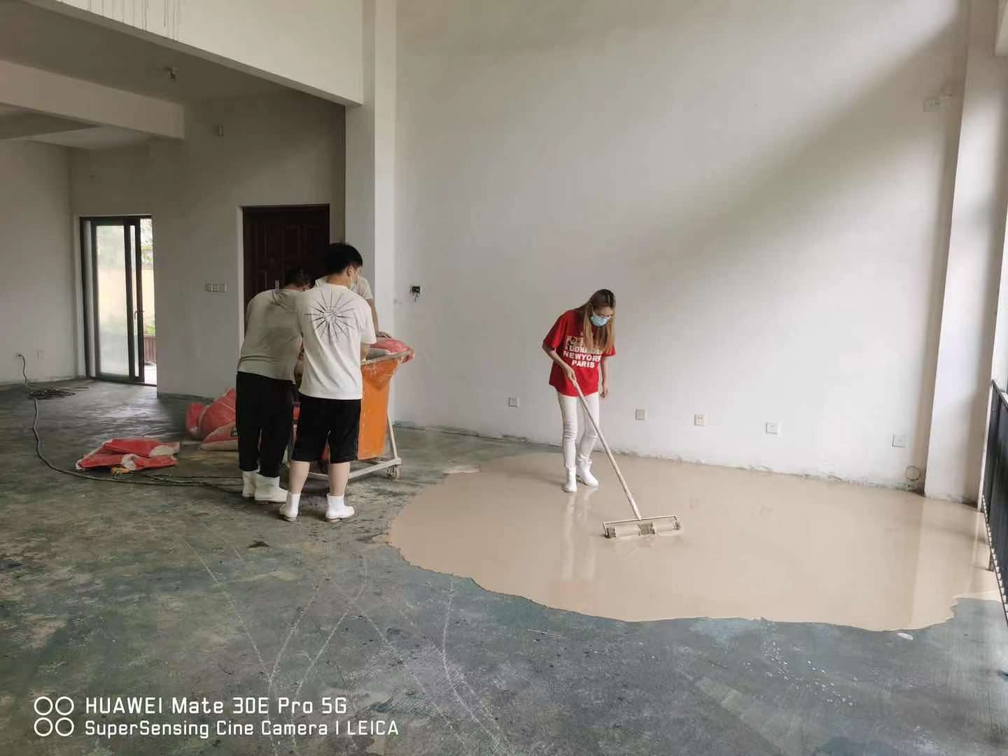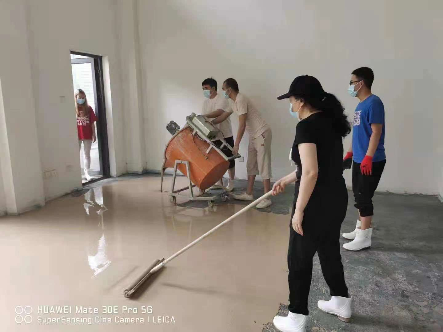 活動(dòng)開(kāi)始,建材事業(yè)部部長(cháng)李茂春組織將到場(chǎng)員工分成兩班組施工,各司其職,各班組有序施工。將一定比例的石膏基自流平與水混入攪拌桶內,持續攪拌約3分鐘,一次性倒在地面上,自流平的流動(dòng)性好,產(chǎn)品可以根據地面的高低不平順勢流動(dòng),對地面進(jìn)行自動(dòng)找平,無(wú)需外力推動(dòng)。2個(gè)班組耗時(shí)不到8小時(shí),完成450㎡施工作業(yè),等待24小時(shí)后,地面即干燥可使用。我司自產(chǎn)“藍花楹”自流平產(chǎn)品具有品質(zhì)好,施工便捷高效的特點(diǎn)。