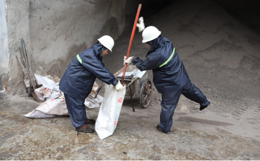 圖三:班組人員裝沙袋至外排水溝防止漿液外泄