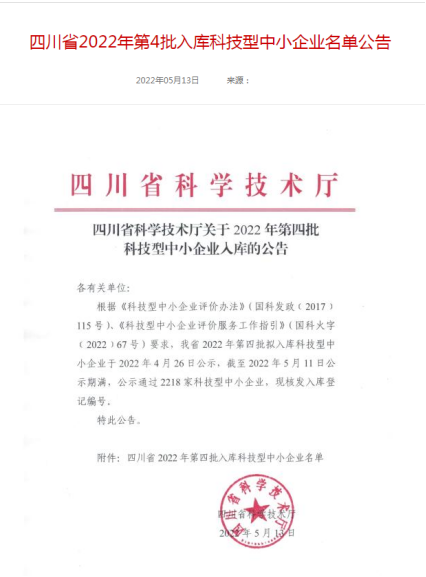 近日,四川藍鼎新材料有限公司順利通過(guò)2022年四川省第4批國家科技型中小企業(yè)認定。