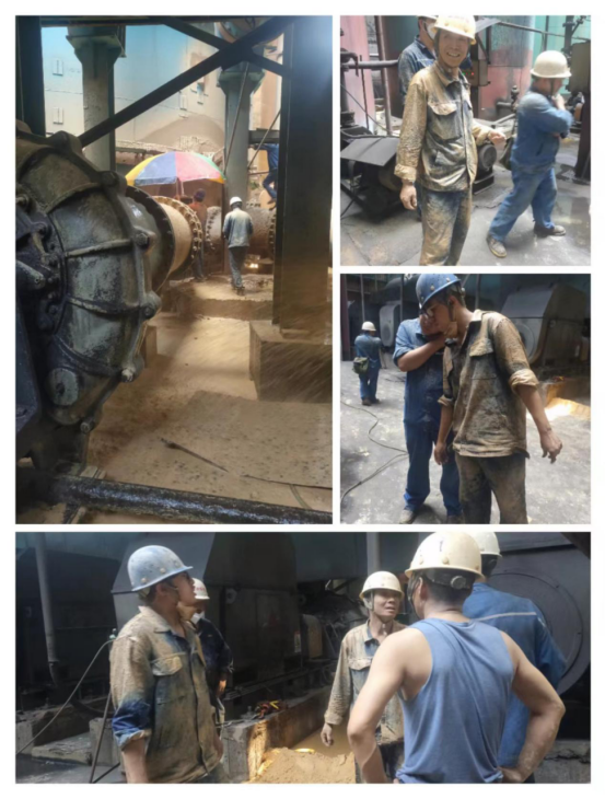 8月10日12:00左右,攀藍鼎2燒1#循環(huán)泵進(jìn)口軟連接破裂,備用泵2#循環(huán)泵進(jìn)口閥無(wú)法開(kāi)啟投入使用,對生產(chǎn)運行造成嚴重風(fēng)險,如不能馬上消除故障,啟動(dòng)備用2#泵,會(huì )導致出口SO2指標不受控,致使前端減產(chǎn)或停產(chǎn)。故障就是指令,出現故障后生產(chǎn)部立即組織檢修班長(cháng)何亮、副班長(cháng)蘇仕國、生產(chǎn)班長(cháng)鄭義現場(chǎng)制定搶修保產(chǎn)方案。