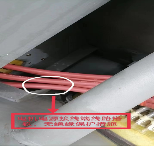 9月8日上午檢修電儀負責人周福和互保對子朱江華正常巡視到球團脫硝增壓風(fēng)機處時(shí),施工人員正準備對風(fēng)機電機頂部進(jìn)行封蓋。于職業(yè)的本能反應,兩人快速對封蓋前的風(fēng)機電機內部進(jìn)行最后一次安全檢查,檢查發(fā)現風(fēng)機內部?jì)商幹卮笤O備安全隱患。第一、高壓電機電源端線(xiàn)路直接緊靠在金屬棱角邊緣,風(fēng)機電機屬于高壓大功率設備,在運行中受到煙氣流量流速,壓力喘振等因素會(huì )產(chǎn)生振動(dòng),如果電源線(xiàn)不進(jìn)行絕緣處理長(cháng)時(shí)間運行,會(huì )導致絕緣外皮破損產(chǎn)生搭鐵短路放炮事故。
