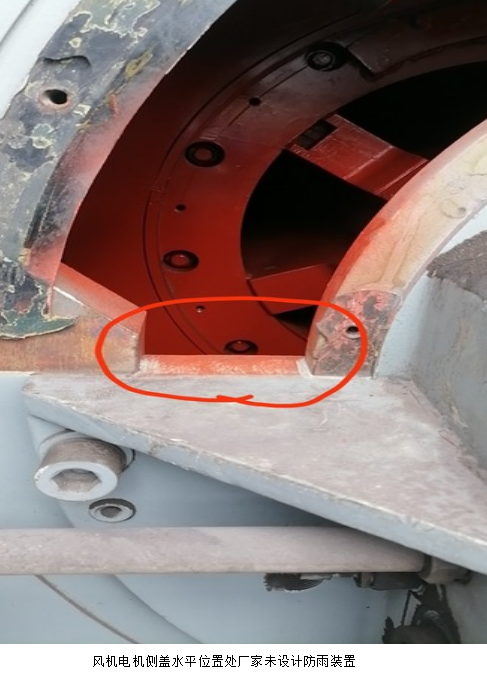 1月27日13時(shí),一號燒結機槽滿(mǎn)停機,對應的一期脫硫脫硝系統正常停機檢修。檢修班按照檢修計劃重點(diǎn)對增壓風(fēng)機電機開(kāi)側蓋檢查,電儀人員首先對增壓風(fēng)機電機執行停電、驗電、接地、換牌、掛牌等安全措施。在檢查過(guò)程中發(fā)現電機側蓋水平位置處電機廠(chǎng)家未設計防進(jìn)水裝置,雖然電機制作了雨棚,但是如遇風(fēng)雨交加極端情況時(shí)電機側面可能存在飄雨,雨水有可能會(huì )進(jìn)入到電機內部的風(fēng)險。