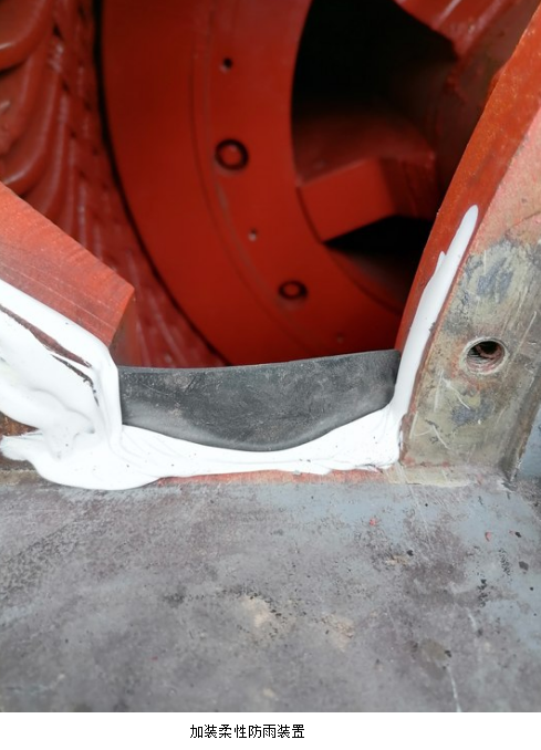 為了消除這一重大險兆安全隱患,電儀人員隨即采取了技改措施,在電機側蓋水平位置處粘接一塊柔性檔雨板。為了確保萬(wàn)無(wú)一失,所有固定螺絲絲牙和端蓋接觸面涂抹密封膠。從技術(shù)措施上防止了雨水進(jìn)入電機。