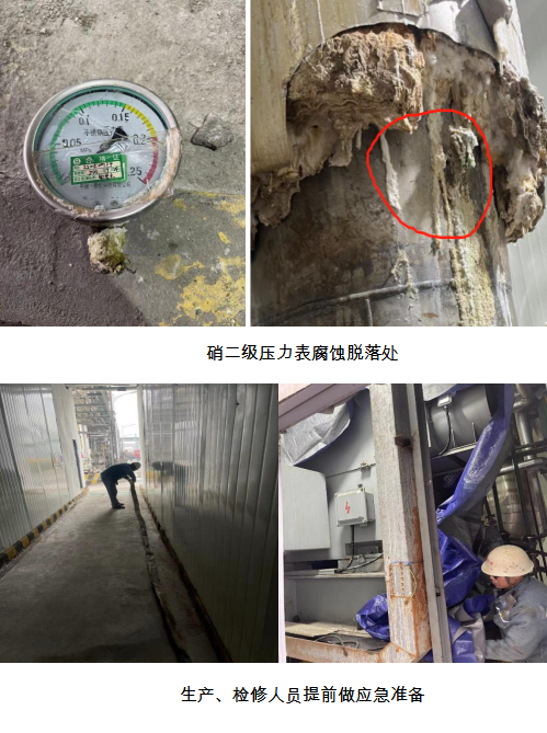 3月4日9:23分蒸發(fā)濃縮硝二級強制循環(huán)蒸發(fā)器循環(huán)管道壓力表腐蝕脫落,硝二級高濃縮液存在泄漏風(fēng)險,乙班白班班長(cháng)林寧和電儀唐亮發(fā)現情況后立即匯報副部長(cháng)楊平,楊平立即匯報生產(chǎn)部長(cháng)黃安軍。若硝二級壓力表脫落,內部80方高濃縮液隨時(shí)會(huì )出現泄漏,將導致重大環(huán)保事故和壓縮機電機有損壞風(fēng)險。生產(chǎn)部隨即組織緊急停機、系統排空,消除潛在風(fēng)險、隱患。