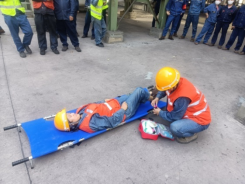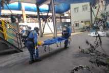 5.31日上午10時(shí)生產(chǎn)部接到有限空間煤氣中毒事故報告,在燒結一期濕法由于煙道檢修,有一名工人煤氣中毒后暈倒。生產(chǎn)部馬上啟動(dòng)應急救援,10:10分兩名救援隊員攜帶擔架、急救藥箱、空氣呼吸機等器材進(jìn)入演練場(chǎng)地,經(jīng)過(guò)現場(chǎng)查看,受傷人員輕度昏迷,救援隊員將受傷人員抬在擔架上,轉移至安全場(chǎng)所進(jìn)行人工呼吸,10:20受傷人員恢復意識。
