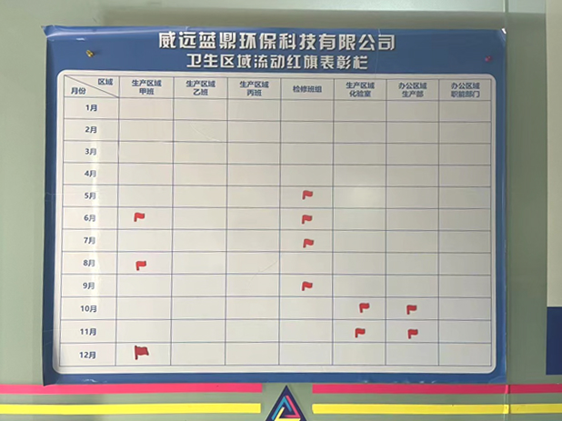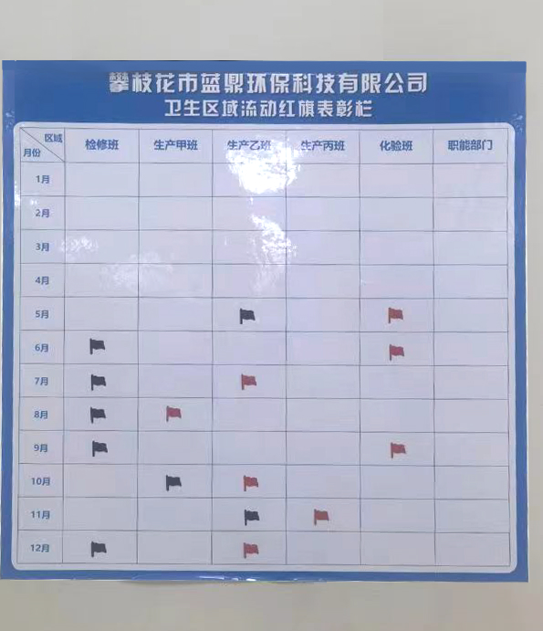 為促進(jìn)工作環(huán)境衛生持續向好發(fā)展,2023年5月,集團為各公司做了衛生分區與責任劃分,同時(shí)設立衛生流動(dòng)紅旗制度,以評估每個(gè)班組的衛生清潔情況。紅旗代表該班組的本月衛生情況最好,黑旗則代表衛生情況不佳,需要整改。到12月底,攀藍鼎、西昌藍鼎、威遠藍鼎2023年度各個(gè)班組的衛生流動(dòng)紅旗評選結果已出爐。