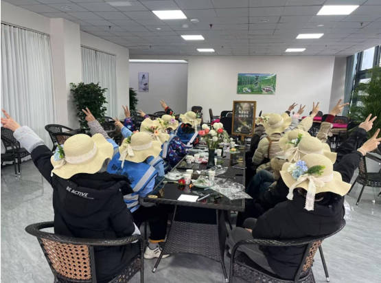 上午11時(shí),創(chuàng )意手作環(huán)節在藍鼎茶坊開(kāi)展,F場(chǎng)備有純色草帽及永生花、絲帶等裝飾材料,女員工們精心挑選花材,巧妙構思造型:有的將向日葵與康乃馨錯落點(diǎn)綴成環(huán)形花冠,有的用絲帶編織出立體蝴蝶結裝飾。大家邊制作邊交流配色心得,互相挑選合適的花朵、協(xié)助粘貼花材。“通過(guò)團隊協(xié)作完成作品,讓我們感受到了自己動(dòng)手創(chuàng )造帶來(lái)的快樂(lè )。”一位參與者如是說(shuō)。