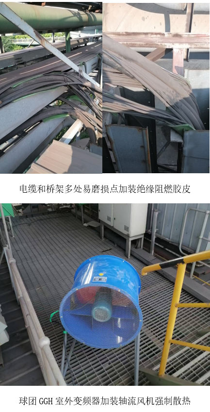 首輪排查聚焦公輔系統電纜橋架。電氣人員發(fā)現電纜與橋架金屬棱角存在外力磨損風(fēng)險,立即在多處易磨損點(diǎn)加裝絕緣阻燃膠皮,實(shí)現“以柔克剛”,杜絕短路及火災隱患。隨后,針對球團GGH室外變頻器柜散熱不良問(wèn)題,技術(shù)人員加裝一臺大功率軸流風(fēng)機,強制排熱,柜內溫度由58 ℃降至43 ℃,保障變頻器長(cháng)周期穩定運行。