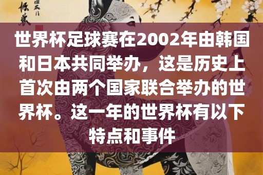 世界杯足球赛在2002年由韩国和日本共同举办,这是历史上首次由两个国家联合举办的世界杯。这一年的世界杯有以下特点和事件