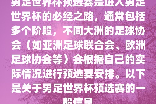 男足世界杯预选赛是进入男足世界杯的重要阶段,需要各支球队认真备战、全力以赴地参加比赛,对于足球迷来说,这也是观赏高水平足球比赛的好机会,如果想要了解具体的男足世界杯预选赛信息,可以关注相关足球协会或赛事官方的消息。