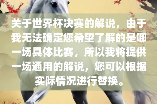 关于世界杯决赛的解说,由于我无法确定您希望了解的是哪一场具体比赛,所以我将提供一场通用的解说,您可以根据实际情况进行替换。