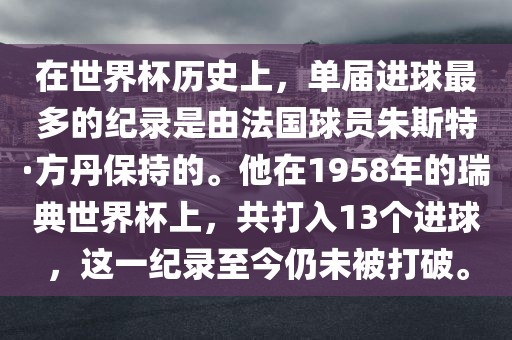 法国球员朱斯特·方丹在1958年瑞典世界杯上创造了单届进球最多的纪录,共打入13个球,这一纪录至今无人打破。他在该届世界杯上的出色表现使他成为足球历史上的传奇人物。