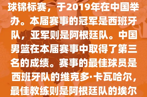 摘要:2019年国际篮联篮球世界杯在中国举办,西班牙队夺得冠军,中国男篮取得第三名。最佳球员为西班牙队的维克多·卡瓦哈尔,最佳教练为阿根廷队的埃尔南多·贝拉斯科。本届赛事创造了多项纪录,包括观众人数超过全球电视观众人数等。