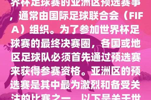 随着足球运动在全球范围内的普及和发展,每一届世界杯足球赛都是全球球迷翘首以盼的盛事,作为世界杯足球赛的重要组成部分,亚洲区预选赛同样备受关注,本次我们将聚焦于即将到来的2022年世界杯亚洲区预选赛,探讨这场足球盛宴背后的故事。